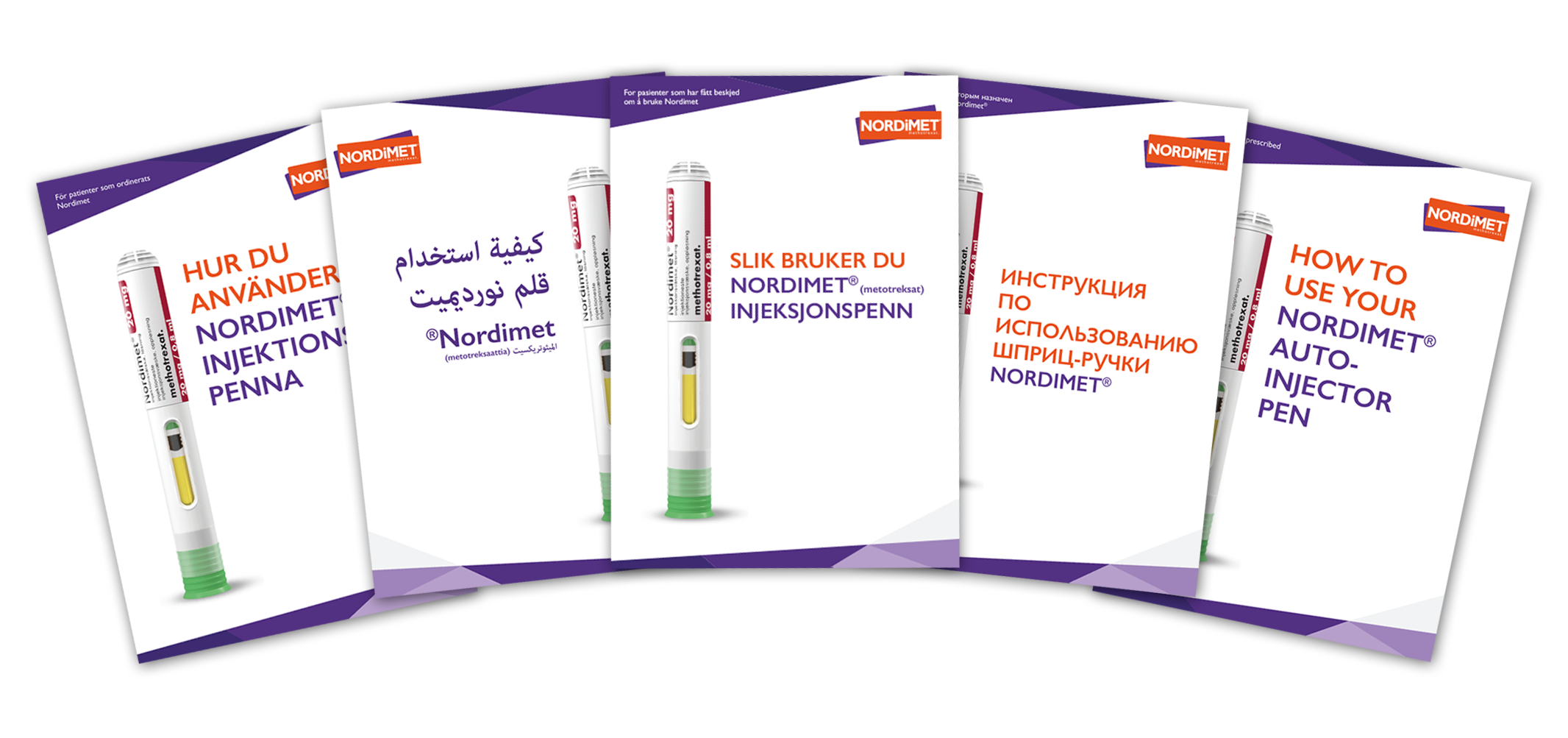For å sikre korrekt bruk av Nordimet injeksjonspenn tilbyr vi nå instruksjonsfilmer på 10 ulike språk. Disse filmene gir en tydelig og visuell guide til hvordan du forbereder, doserer og injiserer medisinen på en sikker måte.